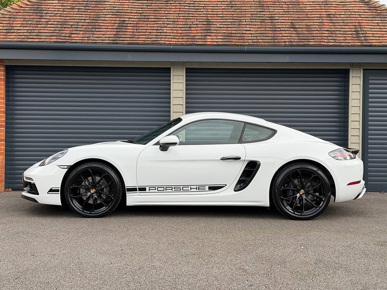 Widely acknowledged as a brilliant little sports car, this Style Edition makes a terrific choice for anyone seeking the fun and thrills of a compact sports car with the reassurance that comes from a car designed and built by a company with a peerless engineering reputation. A visually enhanced version of the standard 718 Cayman, additional equipment includes 20” 718 Spyder Alloys in Gloss Black, Heated Seats, Cruise Control, Heated Steering Wheel, Two Zone Climate Control, Park Assist Front and Rear with Reversing Camera, Electric Folding Door Mirrors, Bi-Xenon Main Headlights, Apple CarPlay & Android Auto, Sound Package Plus, Black Sports Tailpipes & Porsche Crest on Headrests. Appearance and aesthetics aside, this car is of course all about the drive and its 2.0 turbocharged boxer engine does not disappoint, especially when matched to the utterly fabulous 7 Speed Dual Clutch PDK Automatic gearbox. 295bhp and a 0 - 62.5 mph in just 4.7 secs, (only half a second less than the 4.0 litre model) mean this car is no slouch and will power on to 170mph if asked to! Drive it more sedately and 40mpg is perfectly possible. A truly beautifully balanced car, its sublime steering simply adds to the wonderful sense of control afforded to the driver. With just one private lady owner from new and only 8,100 miles, its appeal is enhanced by the inclusion of a number of additional options inc Gloss White Paintwork, Black Leather Interior, Isofix, Exterior Sport Design Package, Exclusive Design Fuel Filler Cap, Graphics Set in Black, High Gloss Black Rear Wing and Door Release Levers, Deletion of Model Designation, Dynamic Light System, Power Steering Plus, Lane Change Assist, Porsche Entry & Drive, Light Design Package and Bose Surround Sound System. Original cost when New: £65,817. First scheduled service is due in July 2026 or 20,000 miles. (RFL: £195 + Additional VED until July 2030). Inclusive of the balance of the manufacturer’s warranty until July 2027. Competitive finance available on this car inc PCP.